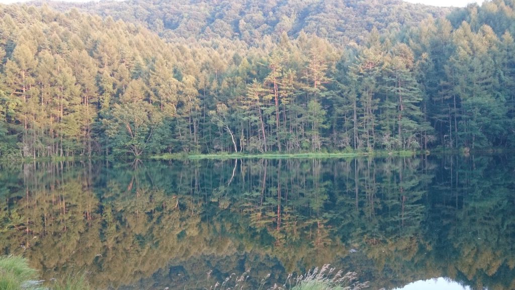 湯の道街道を奥蓼科温泉郷へ向かい明治温泉の手前標高1520mに御射鹿池があります。 ここはが硫黄の成分がありPh3の酸性水で景色が映りこむ景観は他ではない美しさがあります